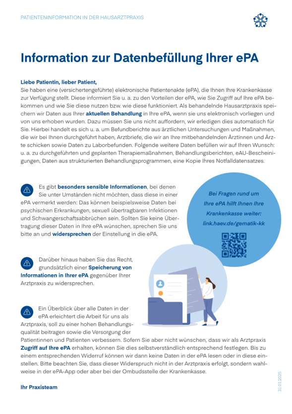 Ab dem 1. Oktober 2025 ist die Nutzung der elektronischen Patientenakte (ePA) gesetzlich versicherter Personen bundesweit verpflichtend für alle Arztpraxen. Sofern Sie der Nutzung Ihrer ePA nicht widersprochen haben, werden wir bei uns erhobenen Dokumente in Ihrer ePA ablegen.