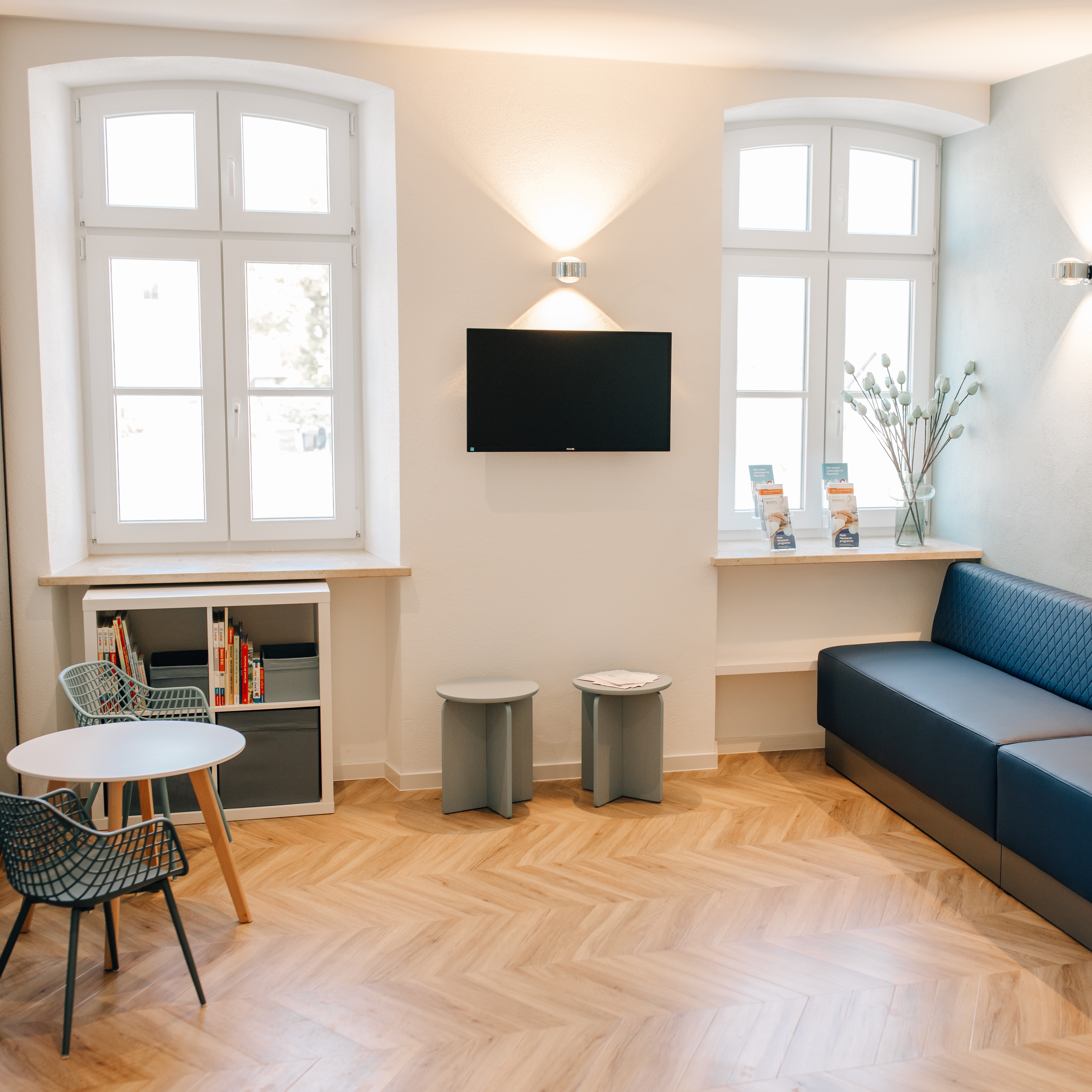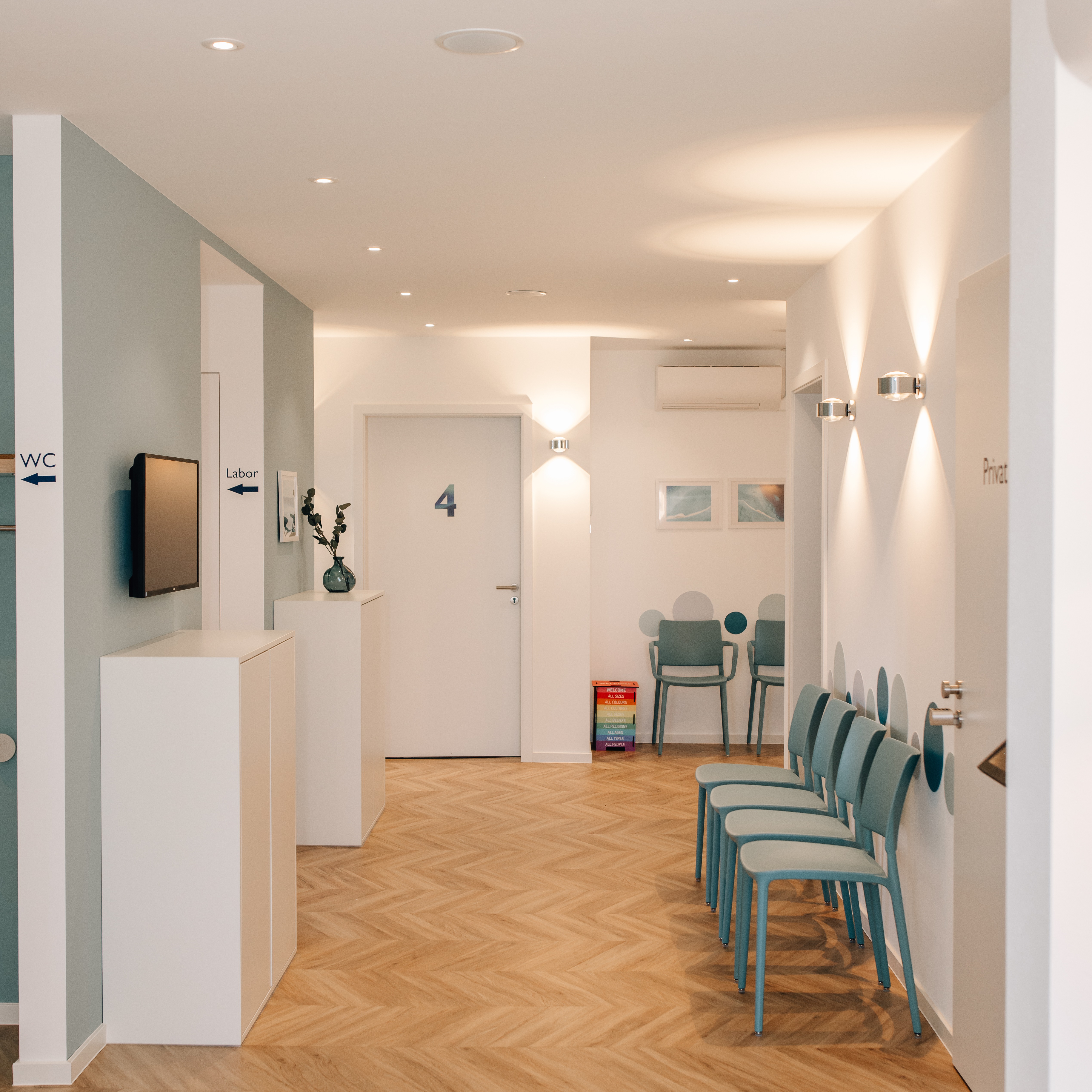 Es befinden sich im 1. Obergeschoss – erreichbar auch per Aufzug – helle, ansprechende und barrierefreie Praxisräumlichkeiten, die mit neuester Technik und modernen Geräten ausgestattet wurden.